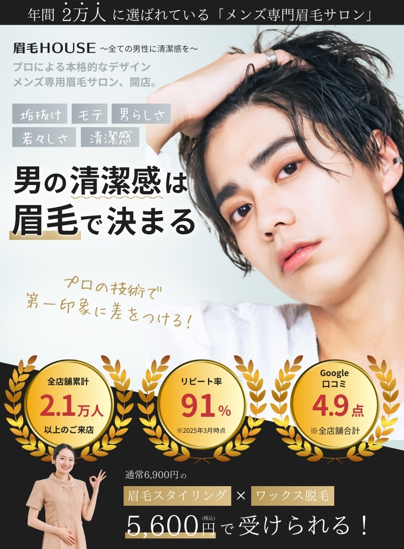 眉毛HOUSEは「メンズ限定サロン」となっております。お客様は「初めてのサロン」という方が多いため、リラックスできるサロン作りを徹底しております。初めてでも安心してご来店ください。